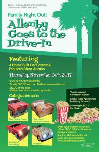 Allenby students arrived to school November 3rd to a mini ‘cruisefest’ with home-built cardboard cars parked in the playground and music to jump-start their day. The morning marked the launch of Family Night Out – Allenby Goes to the Drive-In! Check your child’s backpack for the brochure or visit the APA website for more information.