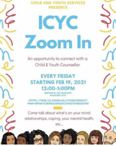 Every Friday from 12-1 pm, students can connect virtually with a Child and Youth Counsellor and have an opportunity to talk about their mental health, relationships, etc.