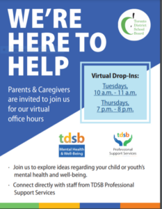 Every Tuesday morning from 10-11 am and Thursday evening from 7-8 pm you are invited to join our virtual office hours to connect with staff from the TDSB Professional Support Services (PSS). PSS colleagues are here to support our caregiver community on the topic of mental health and wellbeing. Visit this link and click on either Tuesday or Thursday to connect.