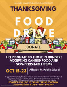 The food drive will run between October 15 and 23. There will be donation bins located in the hallway outside of the library, outside of the office, and in the kindergarten stairwell.