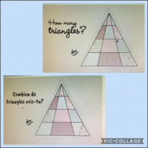 This past month’s Math Challenge “How Many Triangles? / Combien de triangles?” was truly inspirational. Our students, as with every month, from JK to Grade 6, tackled this challenge and used clever reasoning skills to arrive at their answer and share them visually and in writing in both French and English.