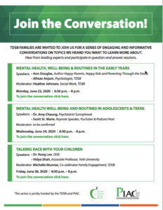 TDSB families are invited by the TDSB and the PIAC (Parent Involvement Advisory Committee ) to participate in a series of engaging and informative conversations about mental well-being and diversity. Hear from leading experts and participate in question and answer sessions.